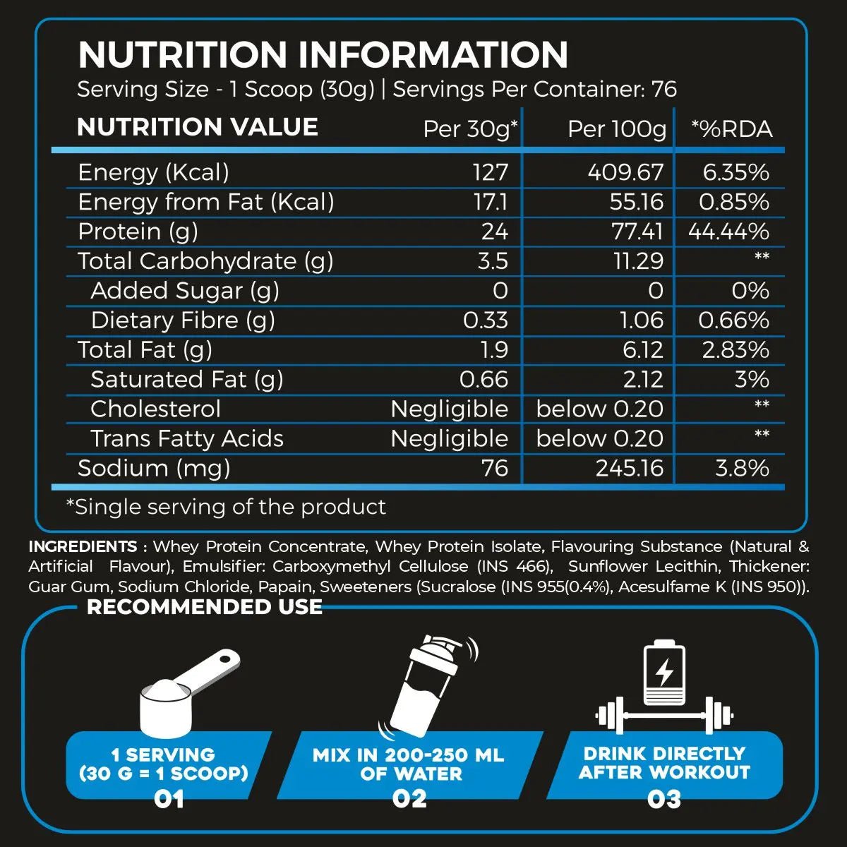 RECOMMENDED USE: Mix 1 scoop with 200ml of water or milk in a shaker or blender. Consume 1 serving between meals and another immediately post exercise or physical activity.WARNINGS: Do not exceed the recommended daily dose. Do not use the product as substitute for a varied diet. Children, pregnant or nursing woman must not take the product. Varied and balanced diet and a healthy lifestyle are important. Do not use if you are allergic to any of the ingredients of the supplement. The product may contain: milk, gluten, eggs, sesame seeds, nuts, celery, Sulphites.