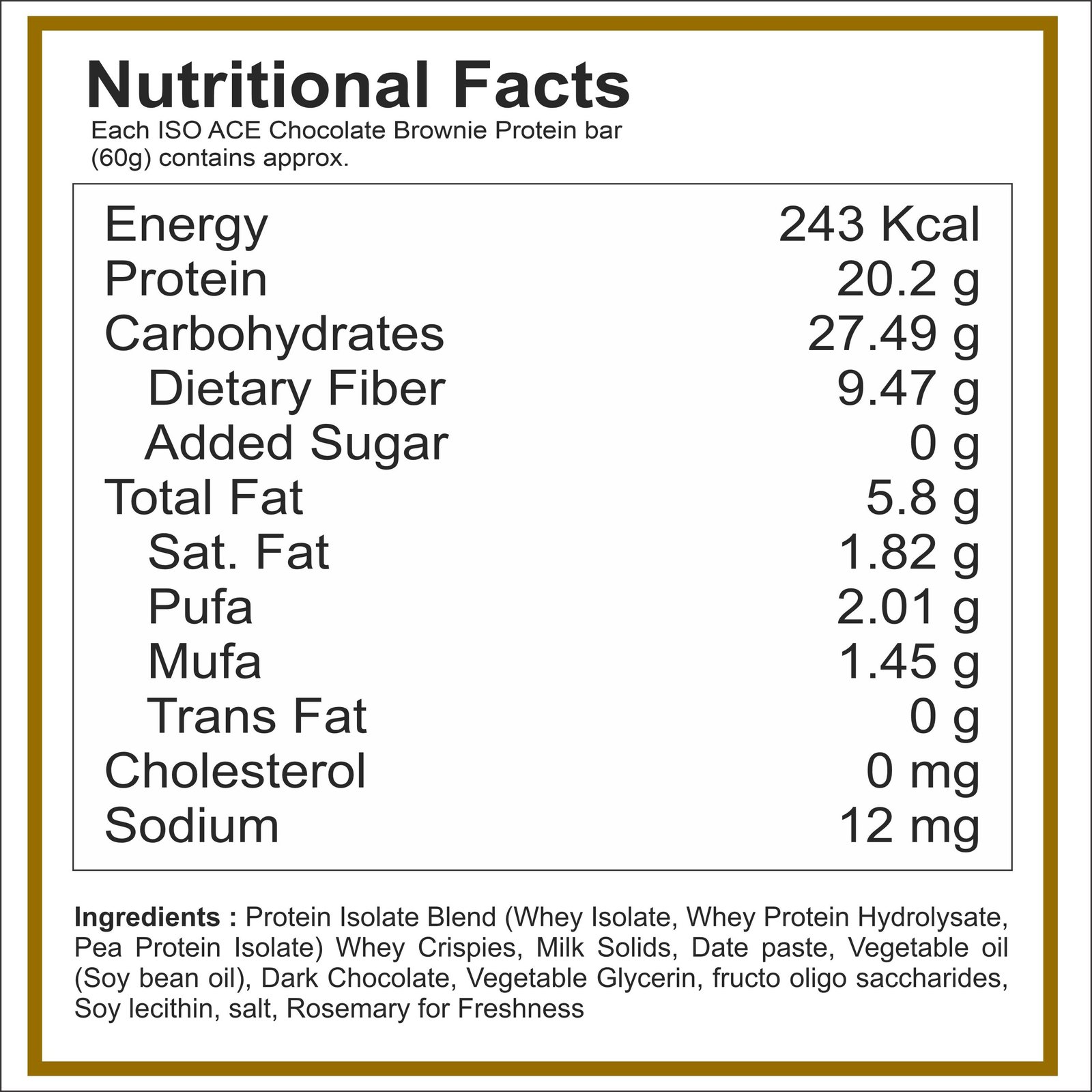 Key Features- - India’s First Isolate Protein Bar , Primary ingredient being Whey Protein Isolate . - ISO ACE Protein Bar is a real delight that will satisfy your taste buds while providing you with a very high quantity of proteins. - The best characteristic about ISO ACE Protein Bar is that it has No Addrd sugar at all and 20gm of Protein.