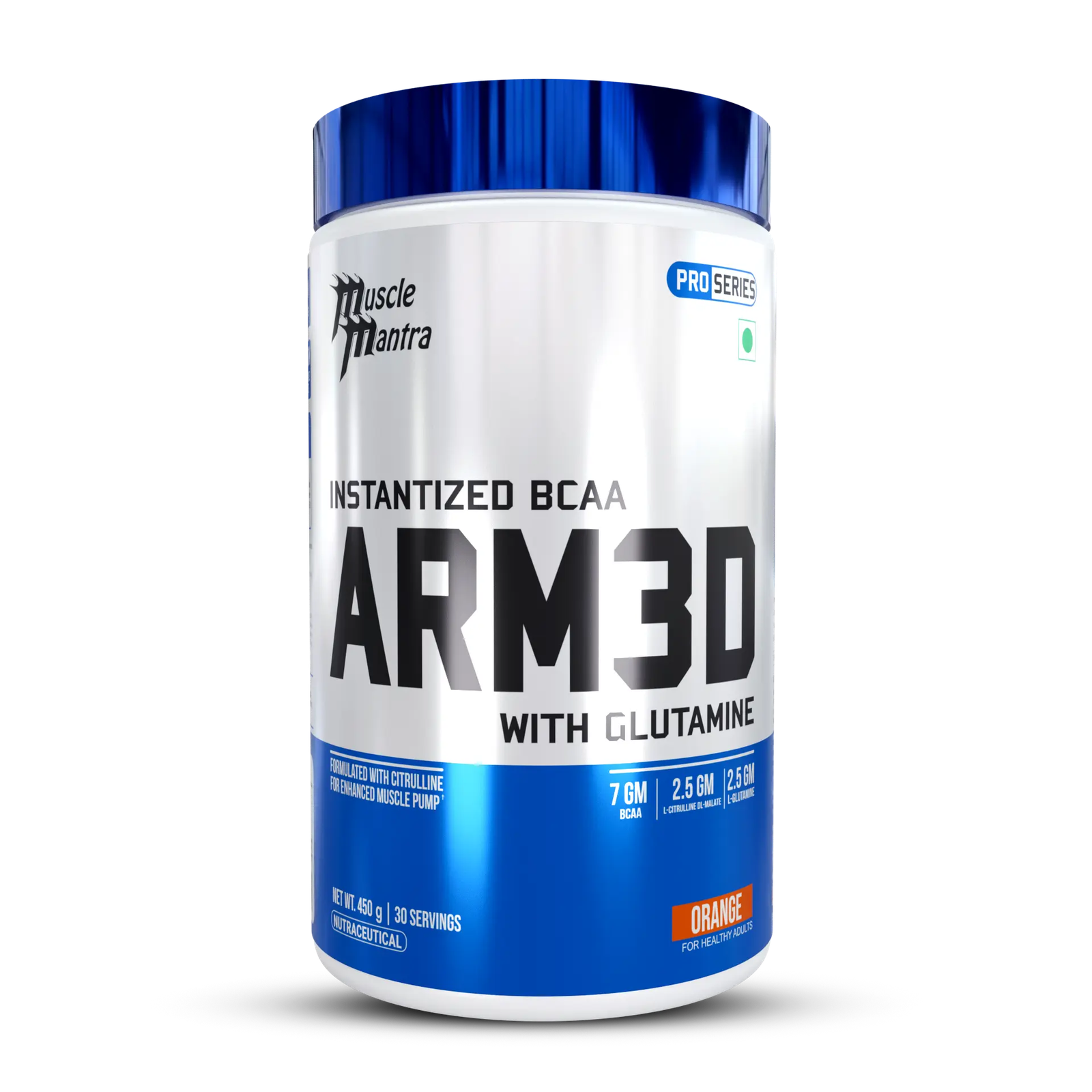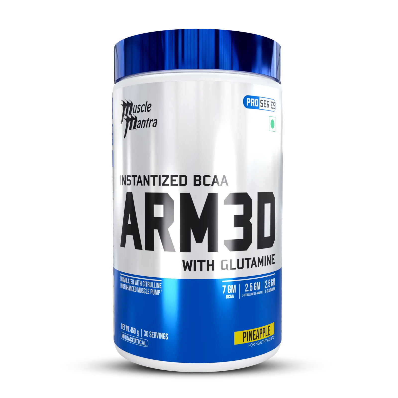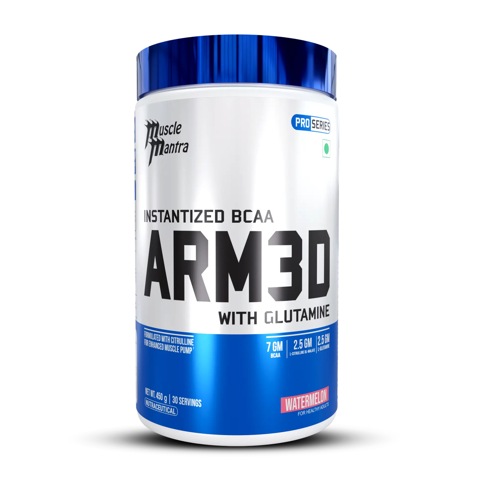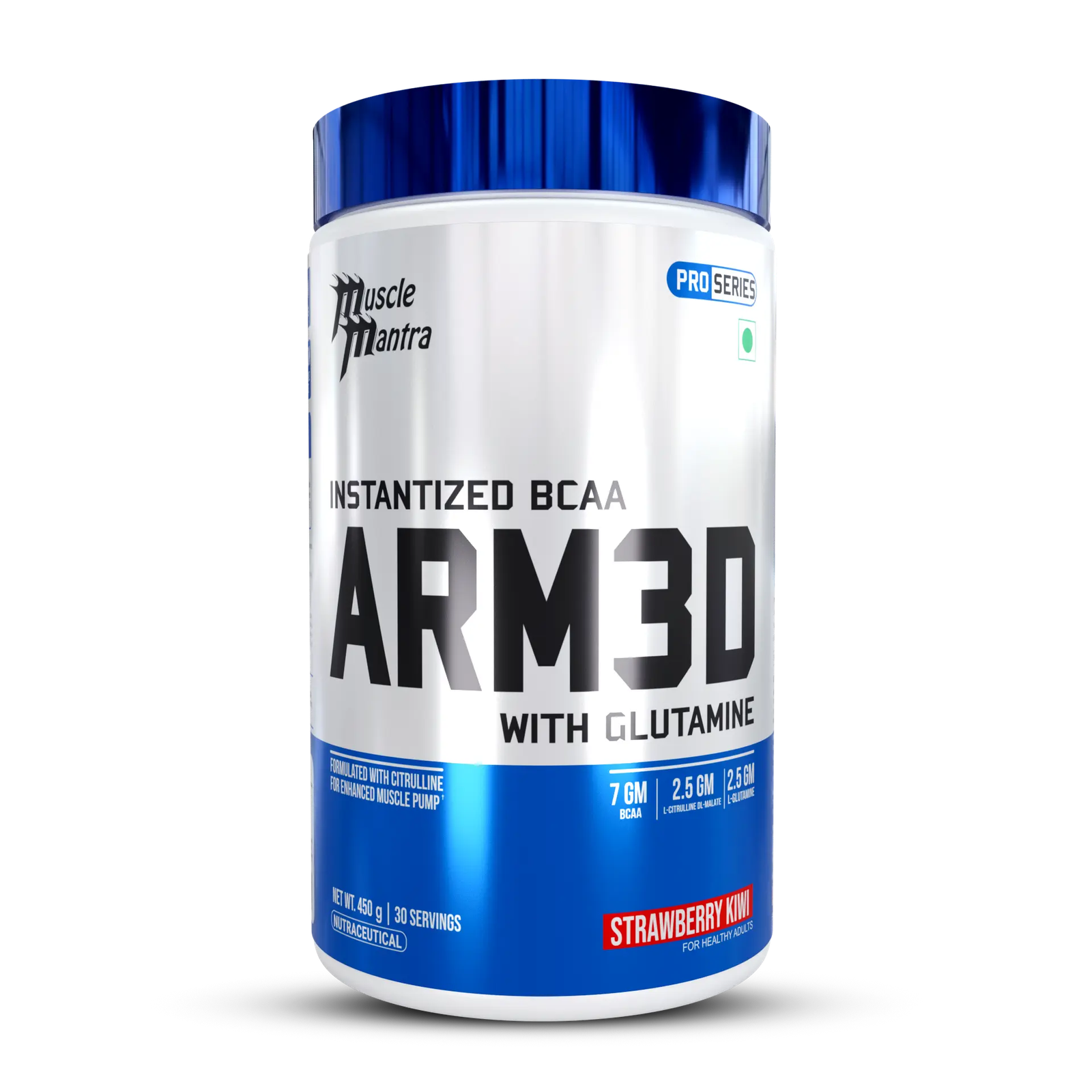 Muscle Mantra ARM3D7 gm BCAA | 2 gm Citrulline Malate | 30 servings- Contains 3500mg L-leucine & 1750mg L-Isoleucine that helps in muscle growth , improves blood sugar levels , help to preserve muscle mass, reduces fatigue during exercise. - Contains 2500mg L- Glutamine & 1750mg L-Valine which makes proteins for muscle tissues, fuels cells that protect our intestines and Supports immune system cells .- It has 2000mg of Citrulline Malate that helps in boosting immunity, having a healthier heart, regulates blood pressure, detoxifies your system and enhances muscle growth, better vascularity and aids weight loss.- it also contains 1000mg Taurine that gives that extra pump during your work.-lysineMuscle Mantra ARM3D is a unique combination of BCAA with Glutamine, Citrulline Malate and Taurine that can be used intra workout to reduce fatigue during exercise and also as an energy drink to get that extra pump before/while working out.